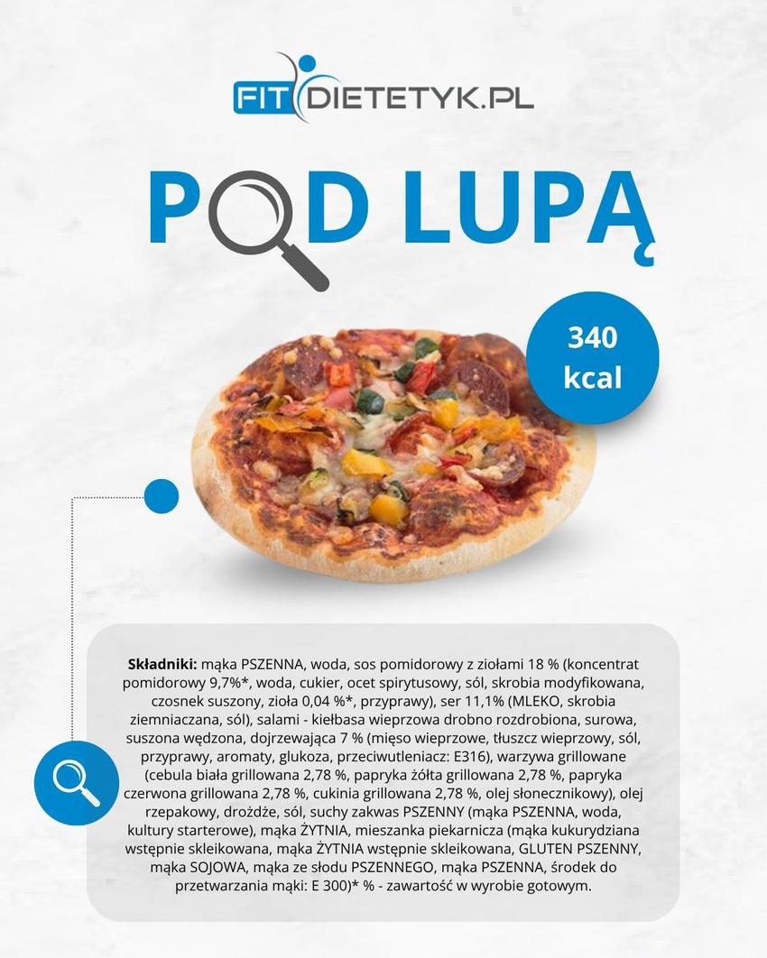 pszenną, wysokoprzetworzoną bazę | sos pomidorowy z cukrem i zagęstnikami | ser zwiększający kaloryczność | salami – przetworzone, tłuste mięso | odrobinę grillowanych warzyw.