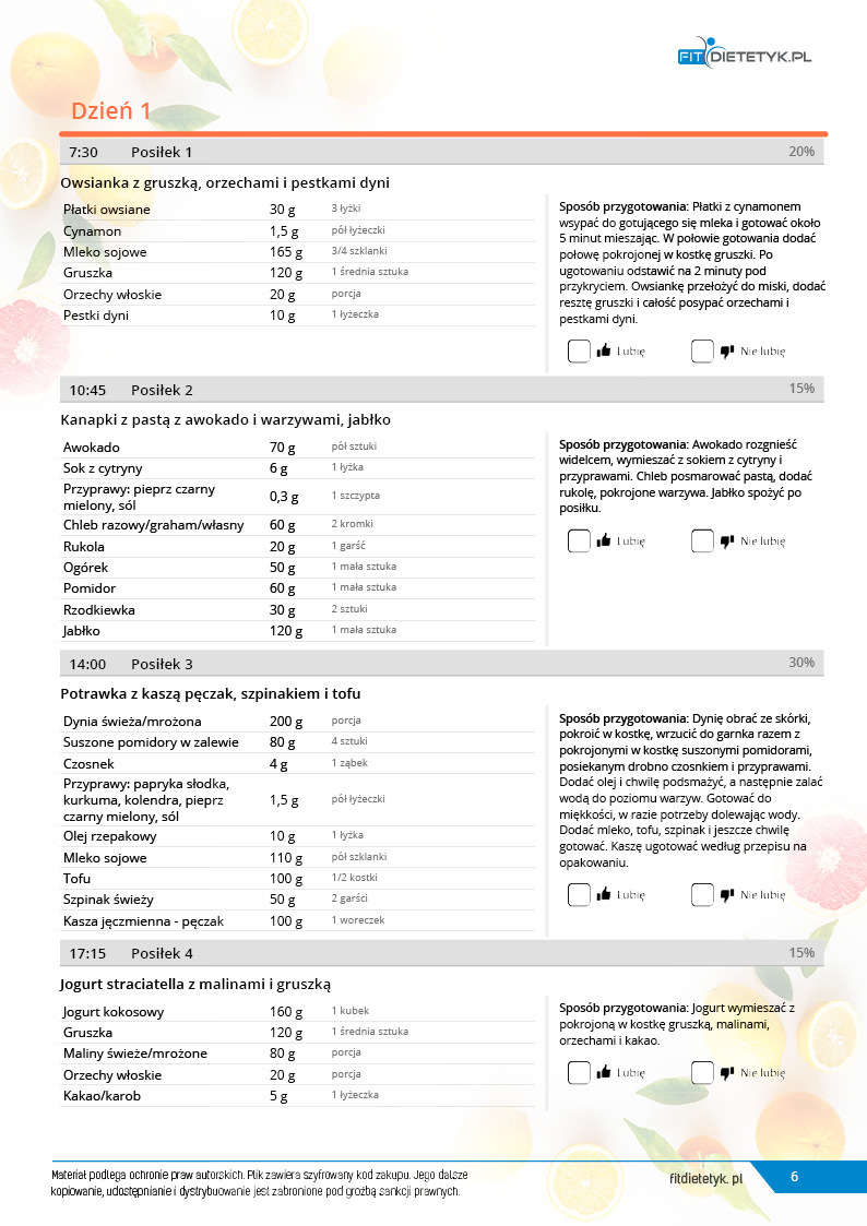 w formie propozycji posiłków (zamiast pojedynczych jadłospisów jednodniowych, przygotowano propozycje kilku propozycji dań na każdy posiłek). Tutaj nie uzależniamy Cię od tego jakie masz np. w danym dniu zjeść śniadanie czy obiad, tylko sam wybierasz sobie ulubione danie z kilku przedstawionych przez nas propozycji.