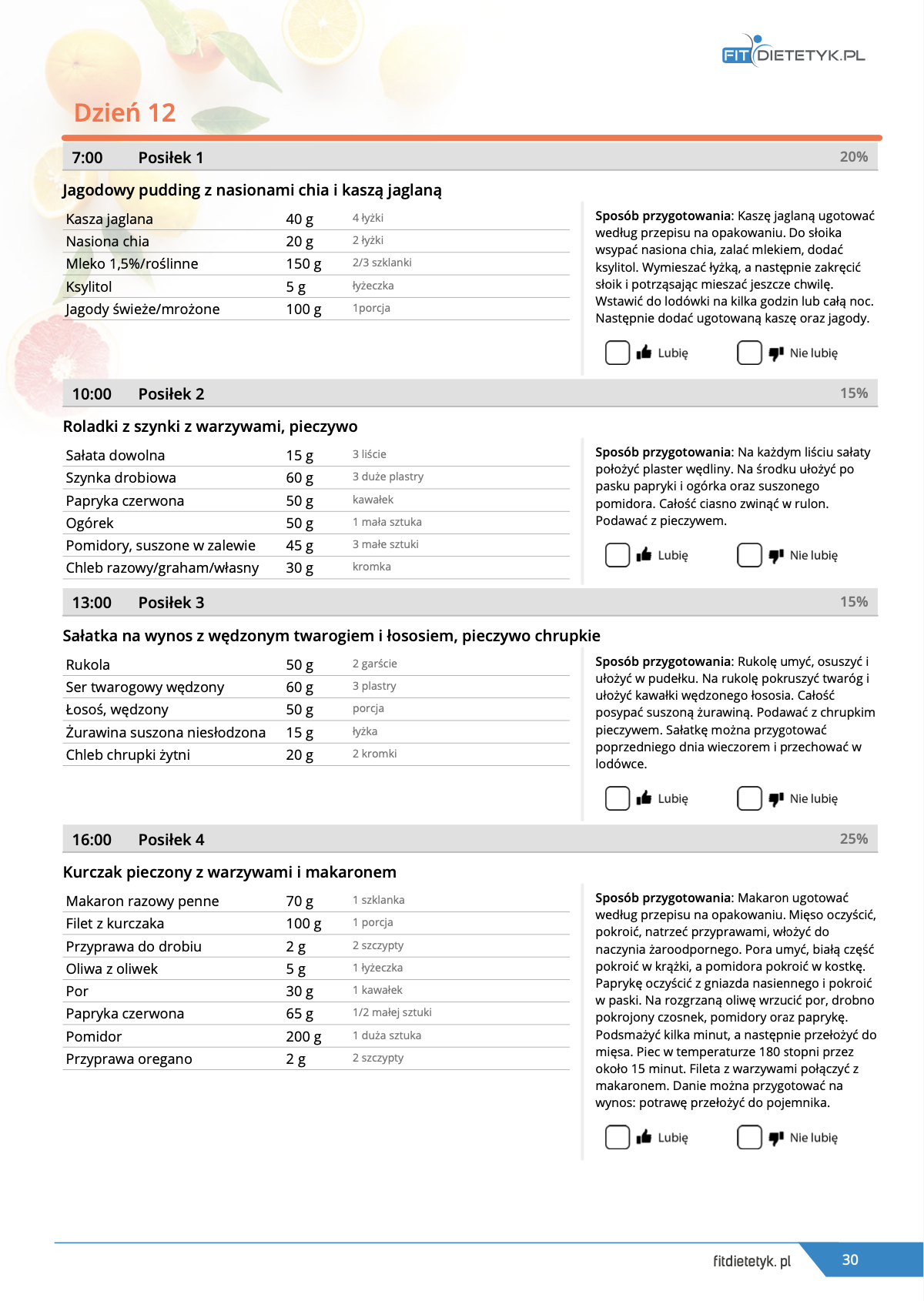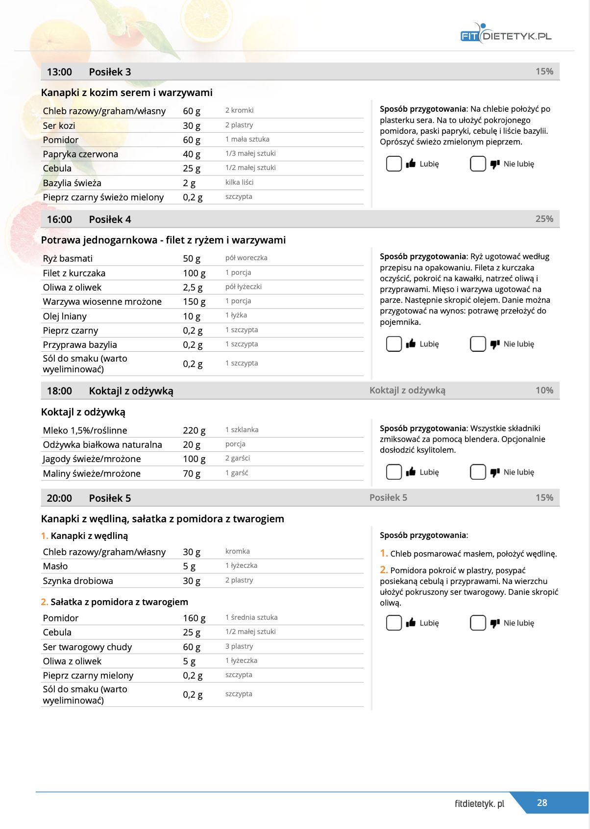 w formie propozycji posiłków (zamiast pojedynczych jadłospisów jednodniowych, przygotowano propozycje kilku propozycji dań na każdy posiłek). Tutaj nie uzależniamy Cię od tego jakie masz np. w danym dniu zjeść śniadanie czy obiad, tylko sam wybierasz sobie ulubione danie z kilku przedstawionych przez nas propozycji.
