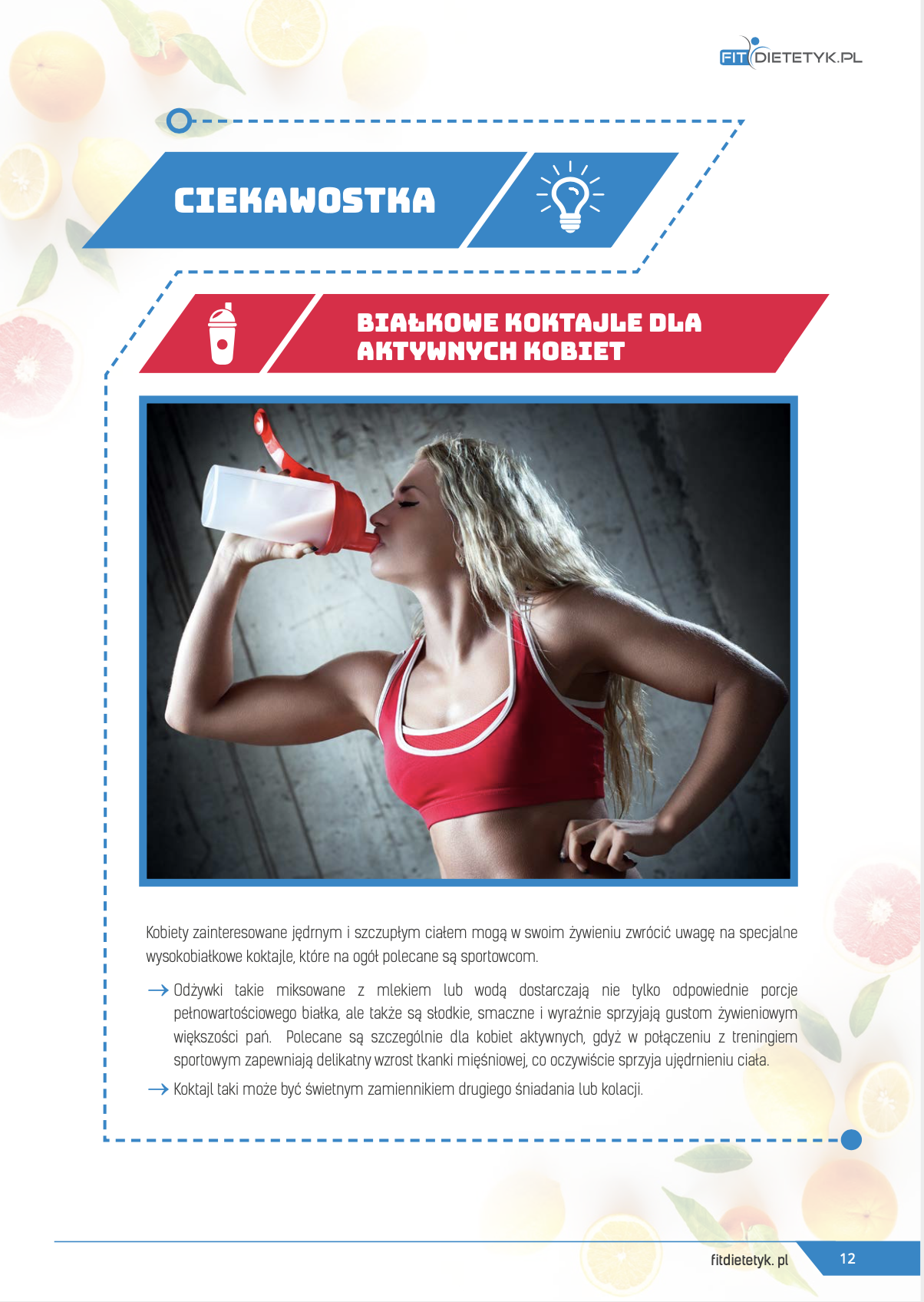 Dieta redukcyjna o kaloryczności 1800kcal rozpisana na okres 30 dni. Przeznaczona w szczególności dla kobiet, które swoją terapię odchudzającą dodatkowo wspierają aktywnością fizyczną. W diecie zwrócono uwagę przede wszystkim na podaż odpowiedniej ilości białka a także innych składników odżywczych które skutecznie wzmacniają organizm, poprawiają wygląd ciała a także zapobiegają oznakom cellulitu. Obok pysznych i pożywnych posiłków w diecie uwzględniono jako dodatek również odżywkę wysokobiałkową, której zadaniem jest szybsza regeneracja mięśni po wysiłku, oraz wzmocnienie jędrności ciała. Zastosowane koktajle białkowe można pominąć, względnie zastąpić je podobnym produktem przygotowanym samodzielnie.