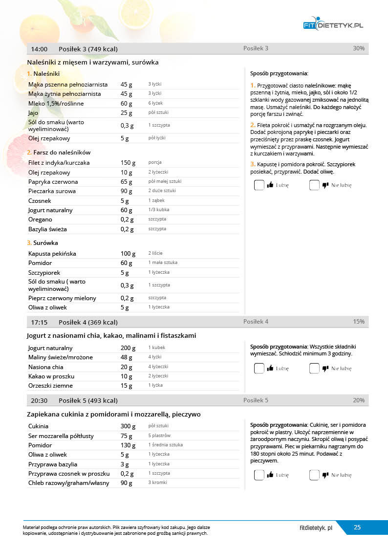 w formie propozycji posiłków (zamiast pojedynczych jadłospisów jednodniowych, przygotowano propozycje kilku propozycji dań na każdy posiłek). Tutaj nie uzależniamy Cię od tego jakie masz np. w danym dniu zjeść śniadanie czy obiad, tylko sam wybierasz sobie ulubione danie z kilku przedstawionych przez nas propozycji.