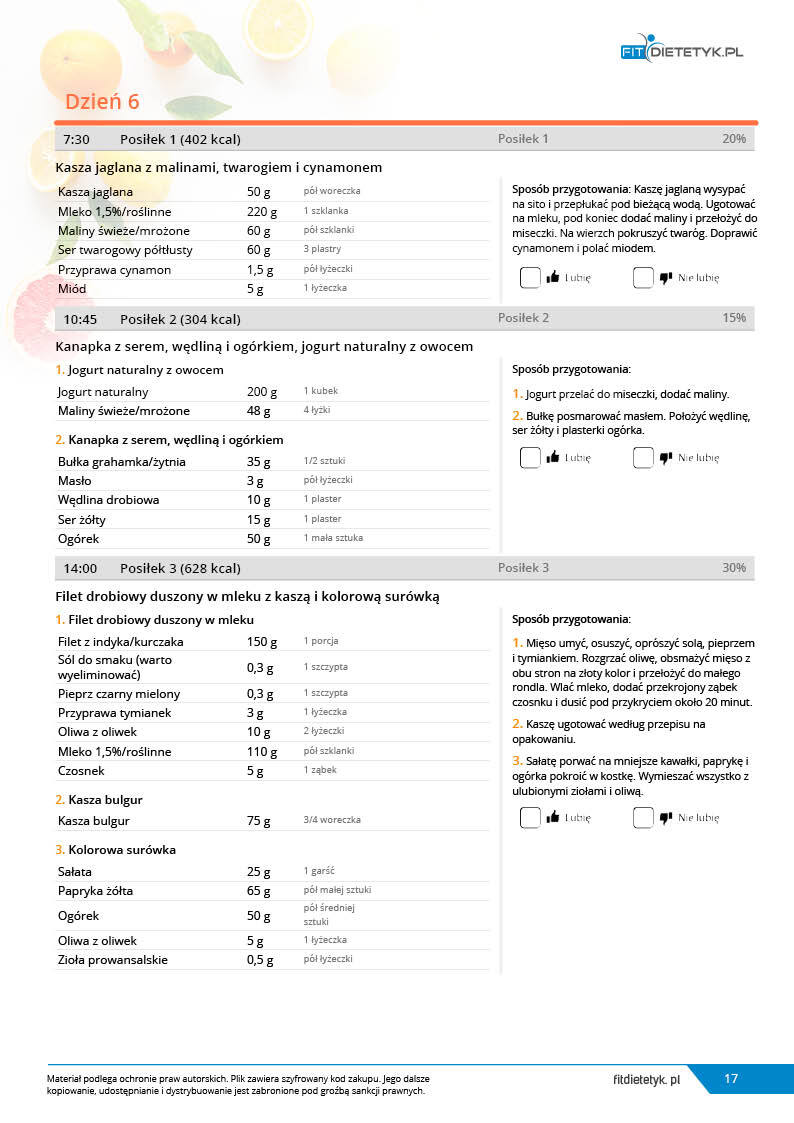 w formie propozycji posiłków (zamiast pojedynczych jadłospisów jednodniowych, przygotowano propozycje kilku propozycji dań na każdy posiłek). Tutaj nie uzależniamy Cię od tego jakie masz np. w danym dniu zjeść śniadanie czy obiad, tylko sam wybierasz sobie ulubione danie z kilku przedstawionych przez nas propozycji.